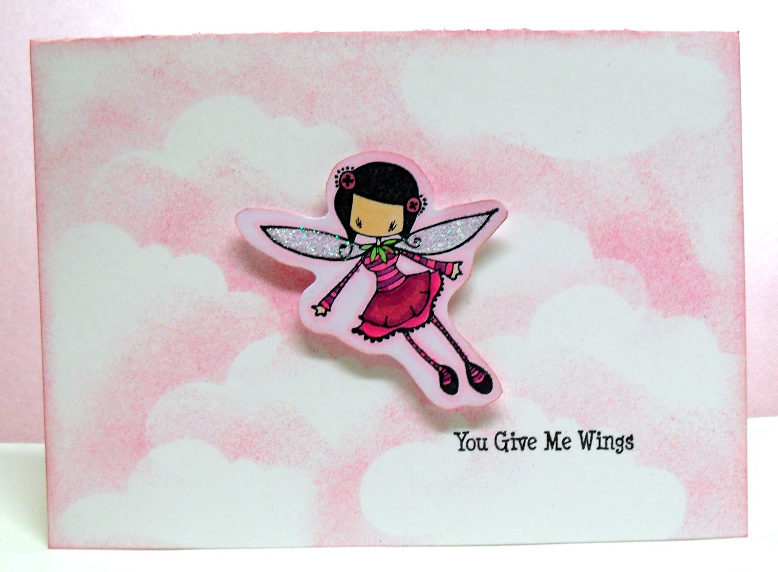 Hi Kimberley - what a lovely little card! Love the pink clouds (they look like candyfloss - yummy!) and your little fairy is soooo sweet :o)